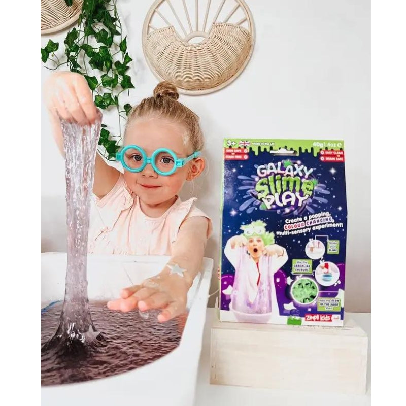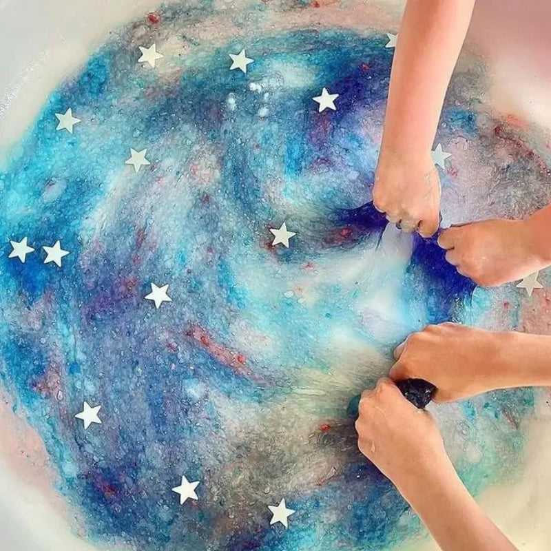 Heerlijk om met je handen door deze slijm te gaan! De geleiachtige slijm ontstaat door het poeder te mengen met warm water. 1 theelepel poeder is genoeg voor 1 liter water. De brijachtige en natte textuur van het slijm, nodigt kinderen uit om te experimenteren: nadat ze de eerste vinger voorzichtig in de slijm hebben gedompeld en de geleiachtige massa hebben gevoeld, zullen de kinderen veel plezier beleven. De massa die kan worden gevormd, geroerd en geplet met beide handen. Wat helemaal bijzonder is, is het knetterend geluid bij deze Galaxy variant! Dit stimuleert de creatieve, cognitieve, sociale, emotionele en fysieke vaardigheden. Met deze Galaxy Slime Play kun je wel 4 liter kleverig slijm maken! Roer de lichtgevende sterren erdoor voor een extra leuke ervaring in het donker!