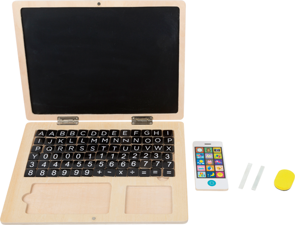 Met deze laptop gemaakt van FSC® 100% gecertificeerd hout, kunnen kinderen een beetje kennismaken met de baan van hun ouders. De letters, leestekens en cijfers zijn magnetisch. Zo kun je gemakkelijk de eerste woordjes of sommen op het magnetische bord maken. Met krijt kan er op het beeldscherm getekend of geschreven worden en dit kan je net zo makkelijk weer verwijderen met het sponsje. De houten mobiele telefoon maakt het plaatje compleet.