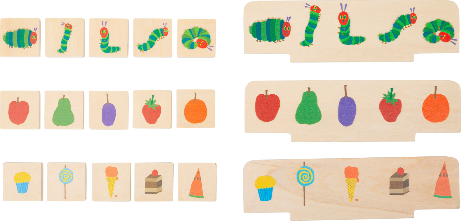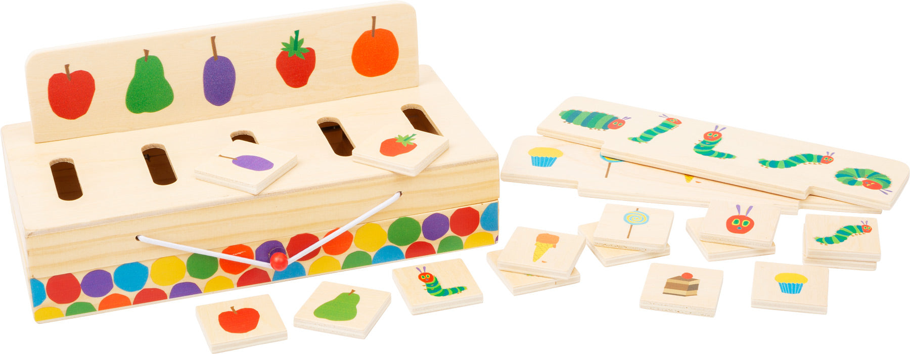 Sorteer de afbeeldingen met rupsje Nooitgenoeg! Dit geweldige 19-delige houten sorteerspel heeft een kleurrijk ontwerp dat vorm- en kleurherkenning stimuleert.