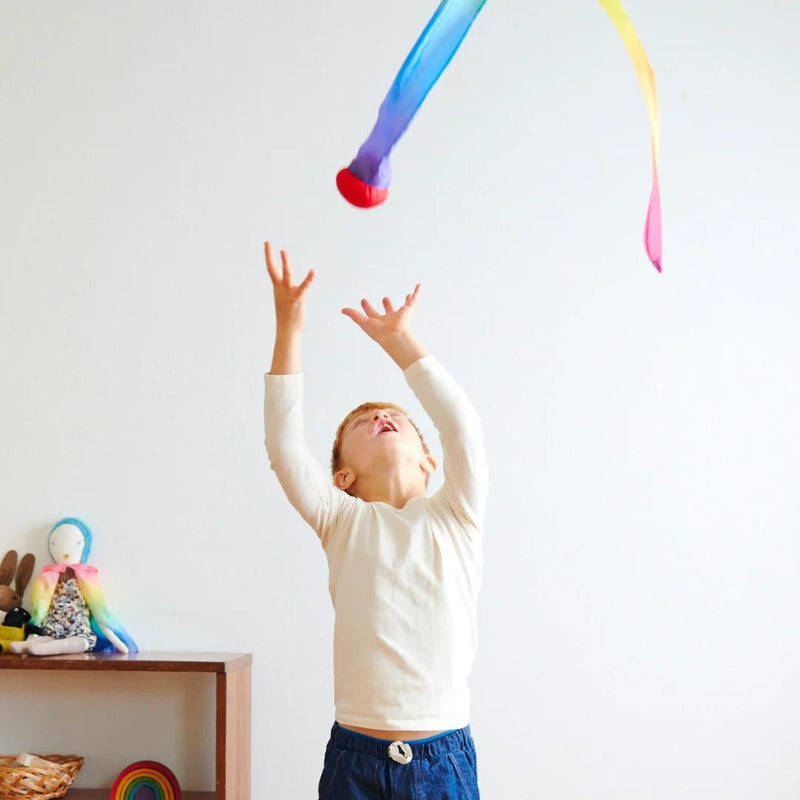 Een prachtig mooie zijden komeet van Sarah's Silks in regenboog kleuren waarmee je goed kunt leren gooien en vangen. Skytail, oftewel staartballen, zijn rubberen ballen (zachte vulling en bedekt met zijde) die gemakkelijk bij de staart kunnen worden gegooid en geen pijn doen als je erdoor geraakt wordt. Leuk speelgoed dat ook rondgedraaid kan worden aan de staart of heel ver geworpen kan worden. Ook stuitert de bal een paar keer over de grond voor meer vangkansen. Deze staartballen moedigen actief spel bij kinderen aan en draagt bij aan de ontwikkeling van de oog-handcoordinatie en de ontwikkeling van de proprioceptie en grove motoriek.