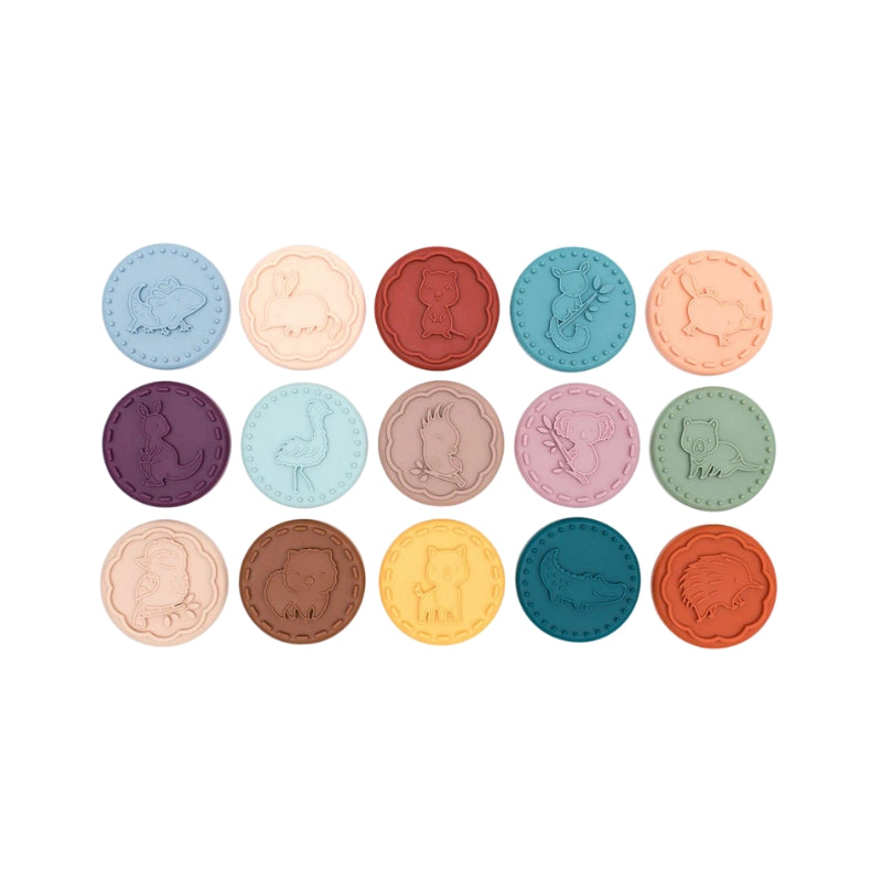 - 15 gemakkelijk verwisselbare siliconen dierenstempels met dieren uit Australie (diameter 6 cm).