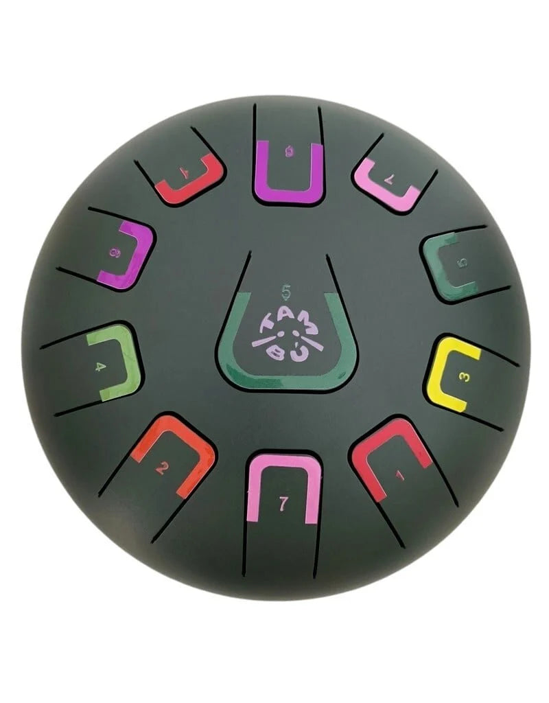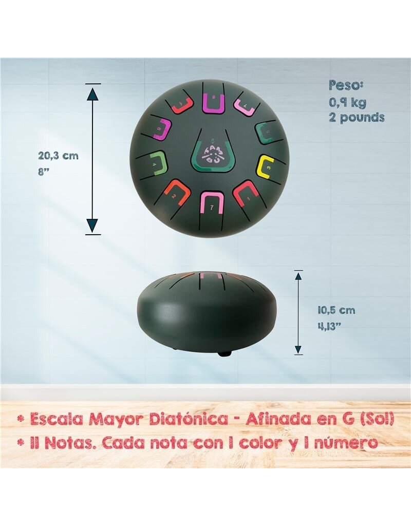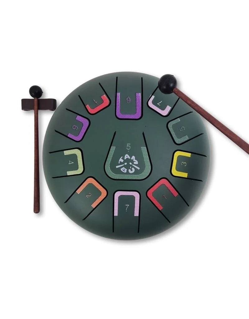 Met de TAMBÚ Steel Tongue Drum ontstaat een unieke muzikale ervaring. Dit metalen percussie-instrument heeft 11 tonen in G majeur en produceert warme, resonerende klanken. Ideaal voor ontspanning, meditatie en muziektherapie.