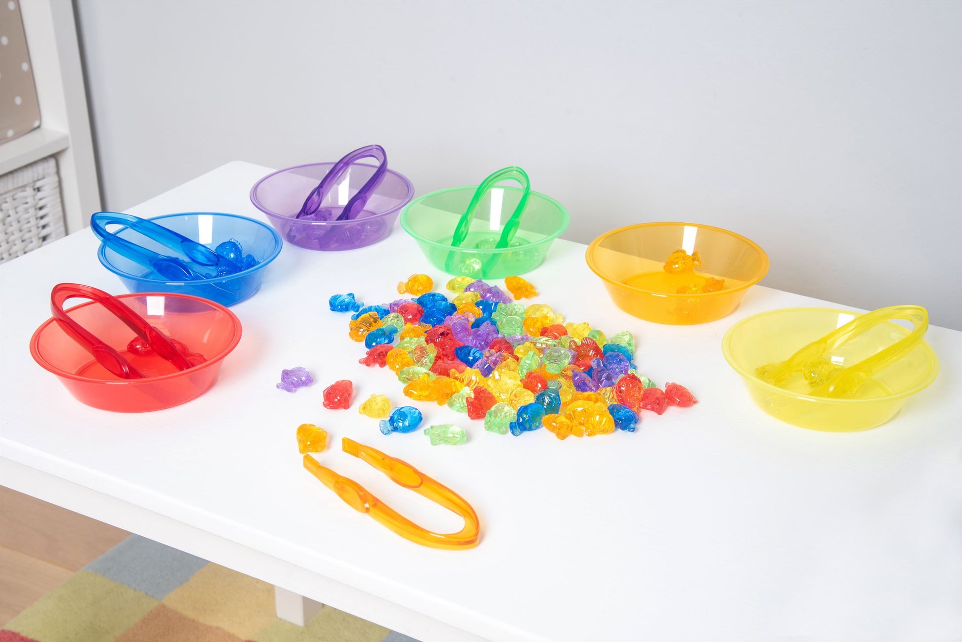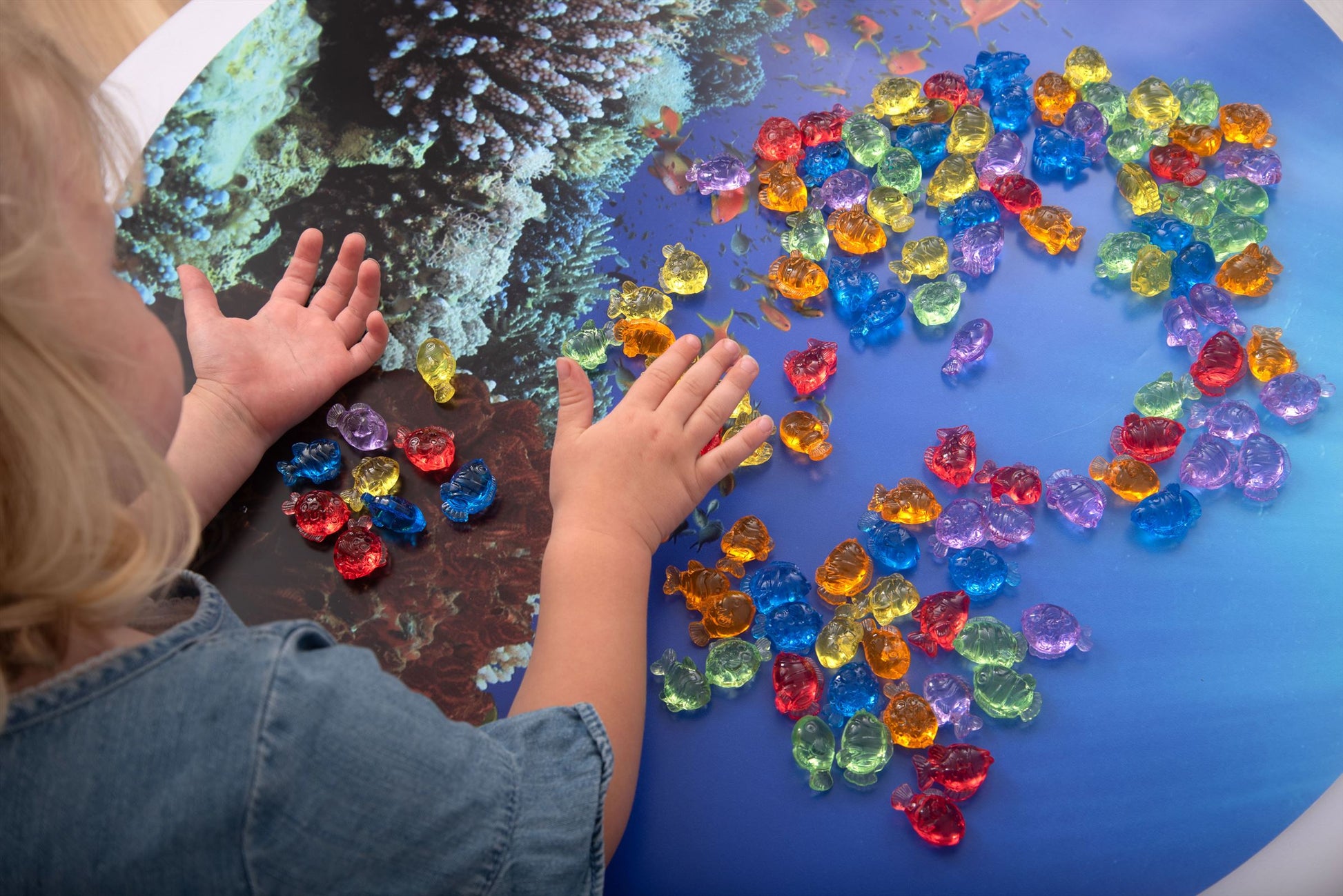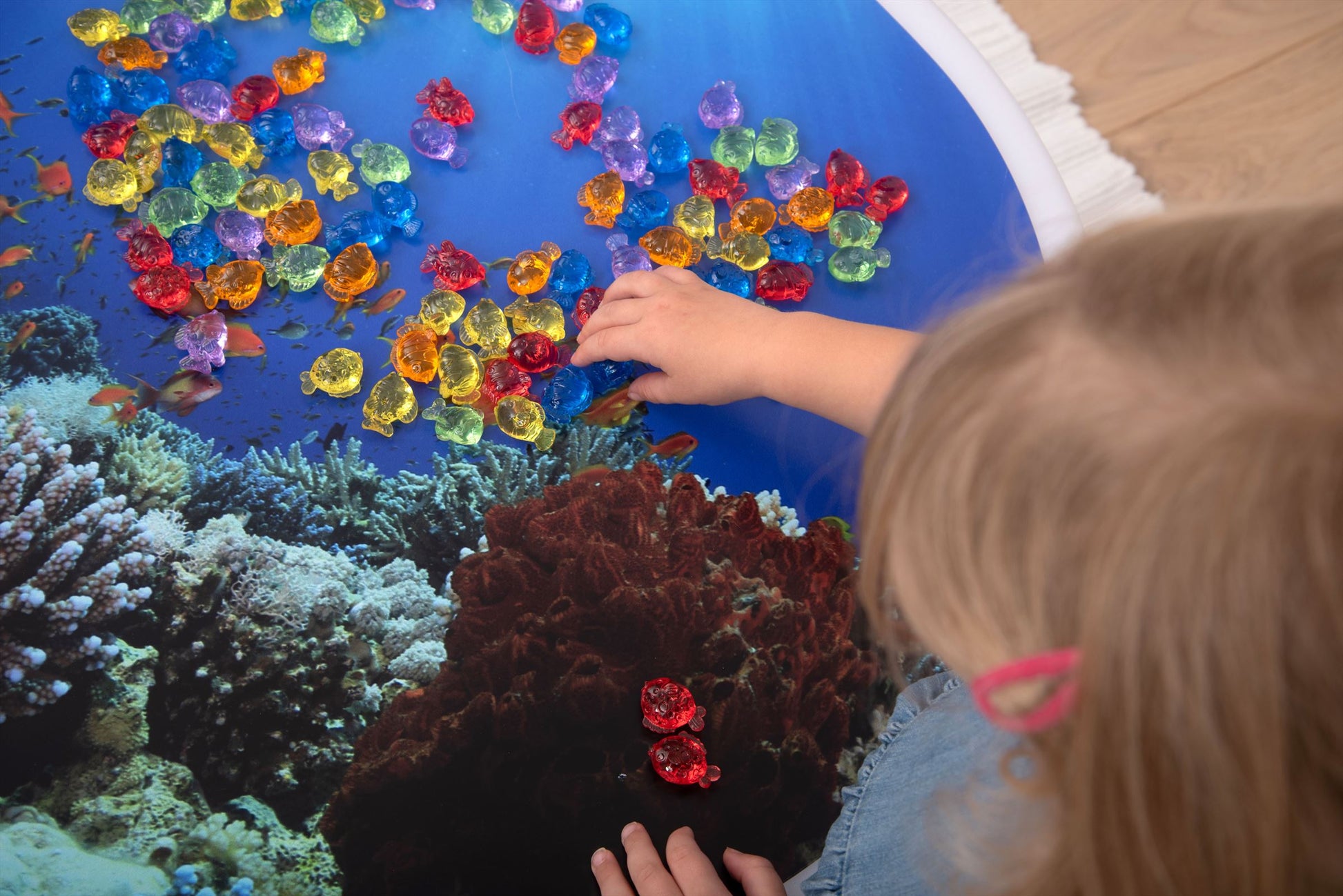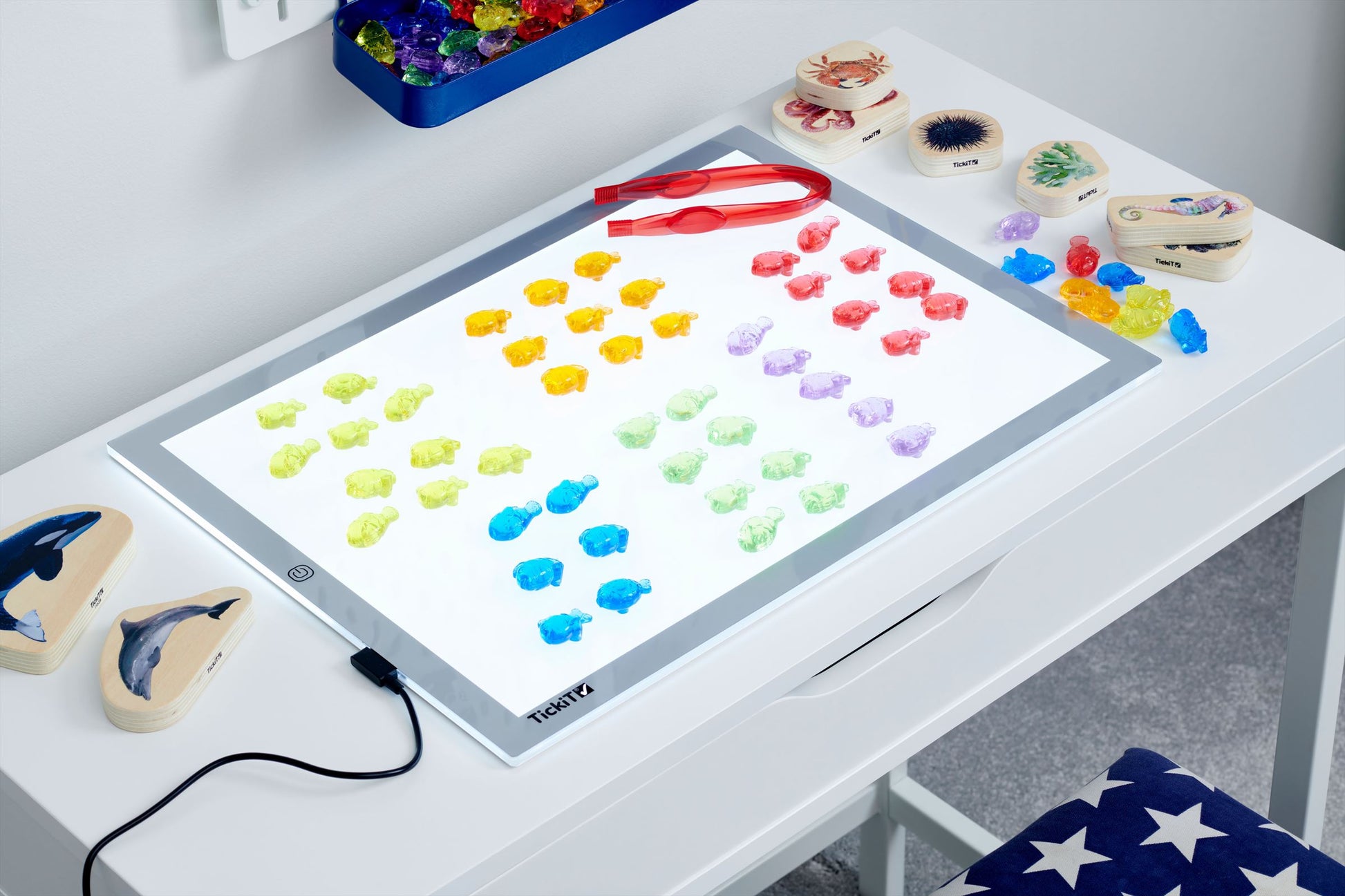 Kom dichter bij het zeeleven met onze TickiT® Translucent Colour Fish. Kleurrijk en gedetailleerd, onze visvormen zijn ideaal voor tellen, sorteren, patronen maken of plezier maken met wiskundeactiviteiten. je kind kan snappers, goudvissen, puffers, maanvissen of guppies optellen, aftrekken, delen of vermenigvuldigen. De doorschijnende eigenschappen maken ze ideaal voor gebruik met een lichtpaneel om de verbeelding van je kind te prikkelen en kleuren en de voelbare markeringen op elke vorm te verkennen.