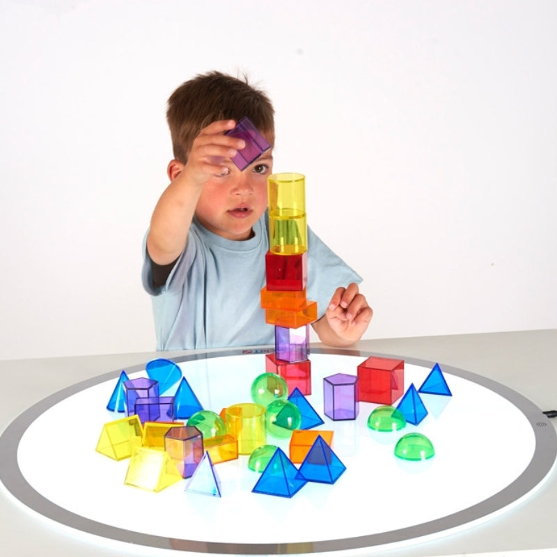 De prachtige vormen variëren in grootte, kleur en complexiteit, waardoor ze geschikt zijn voor kinderen van verschillende leeftijden en vaardigheidsniveaus. Ze kunnen worden gestapeld, gerangschikt en gecombineerd om mooie structuren te bouwen of gewoon om te genieten van het fascinerende spel van licht en kleur dat door de vormen schijnt.