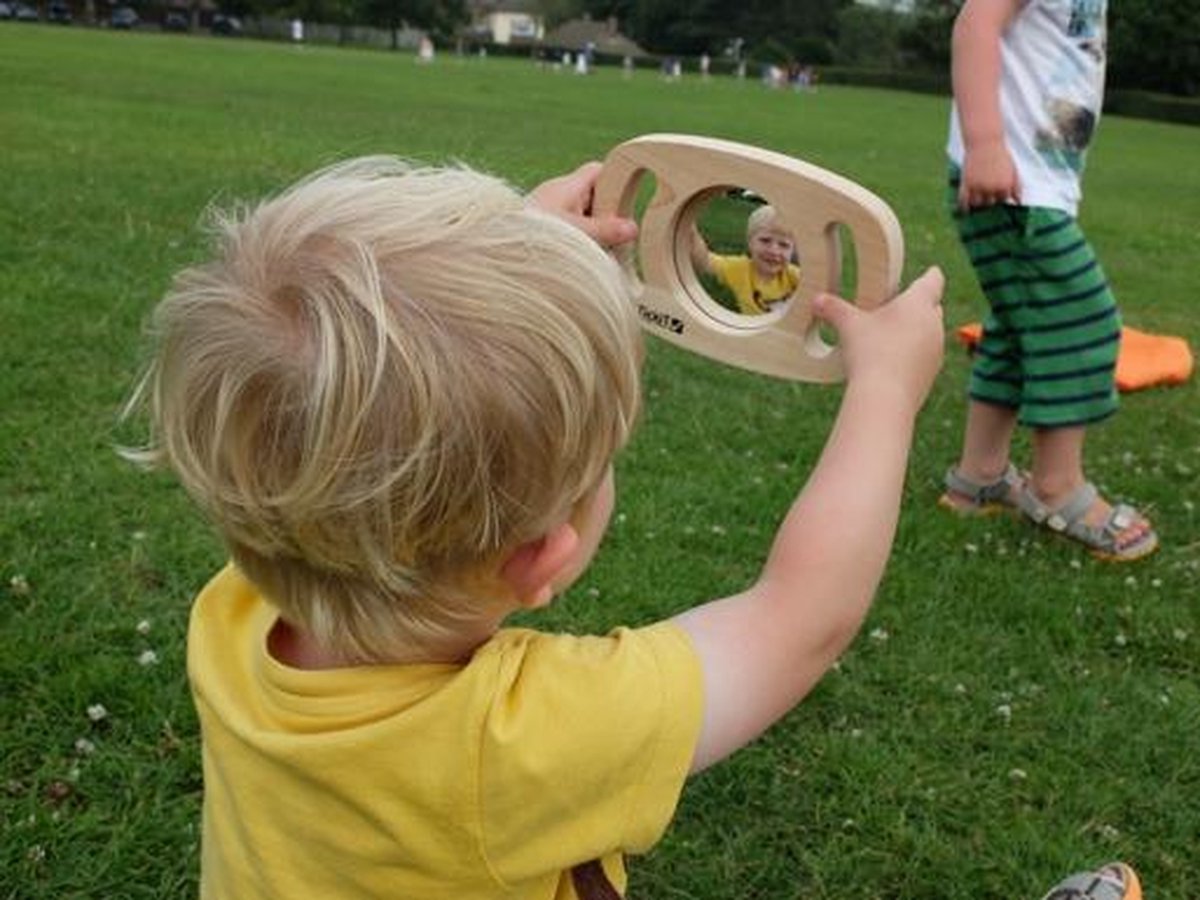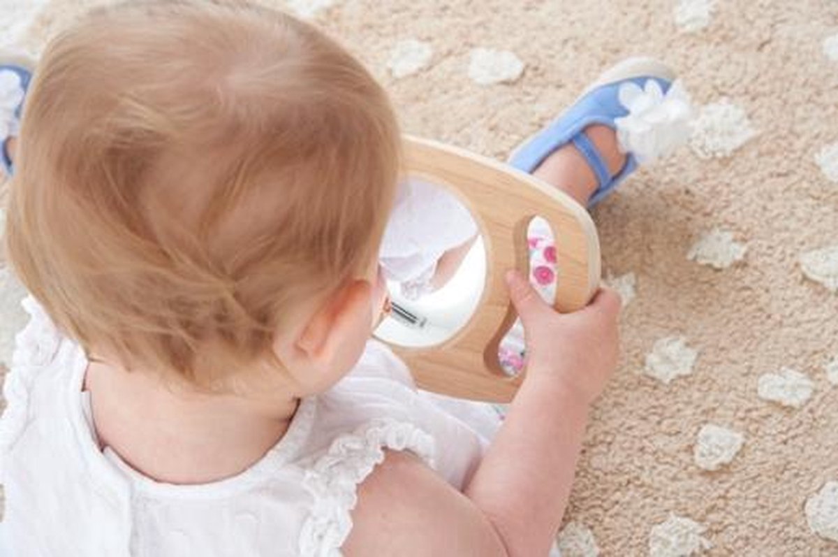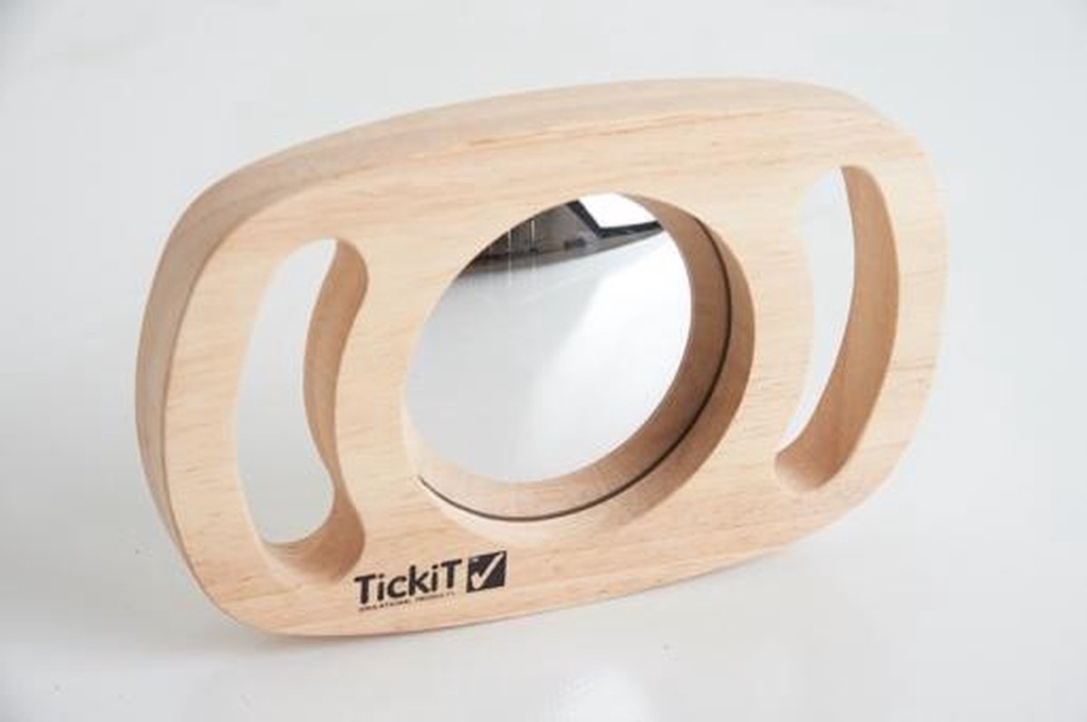 De spiegel zit in een rubberhouten paneel met twee grote handvatten. Hiermee kan je het paneel goed en makkelijk met twee handen vasthouden. Ideaal voor kleine kinderhanden, maar ook voor volwassen die minder kracht of mindere functie in de handen hebben. De spiegel is licht in gewicht