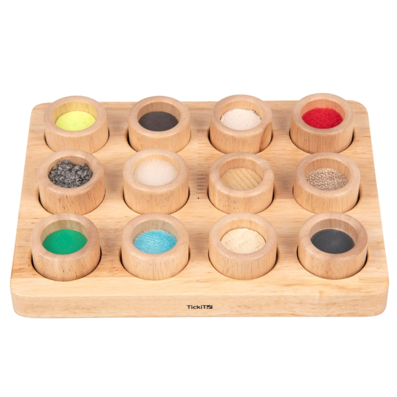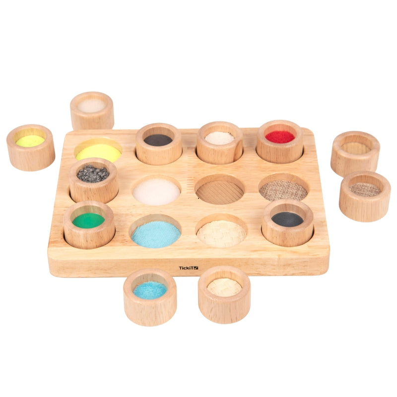 De memory bevat ronde bakje met verschillende texturen, reliëfpatronen en materialen. Kinderen kunnen voelen en ontdekken terwijl ze proberen de bijpassende opening in het bord te vinden. Dit bevordert de tastzin en de fijne motoriek.