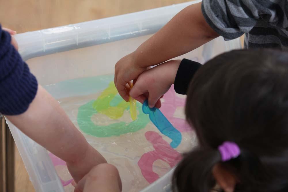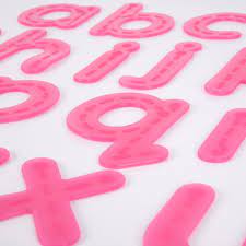 Transparante roze siliconenletters die sterk, zacht en buigzaam zijn en kunnen worden gebruikt in het dagelijkse spel - in de zandbak, op de vloer, op een lichtpaneel of lichttafel en in water.