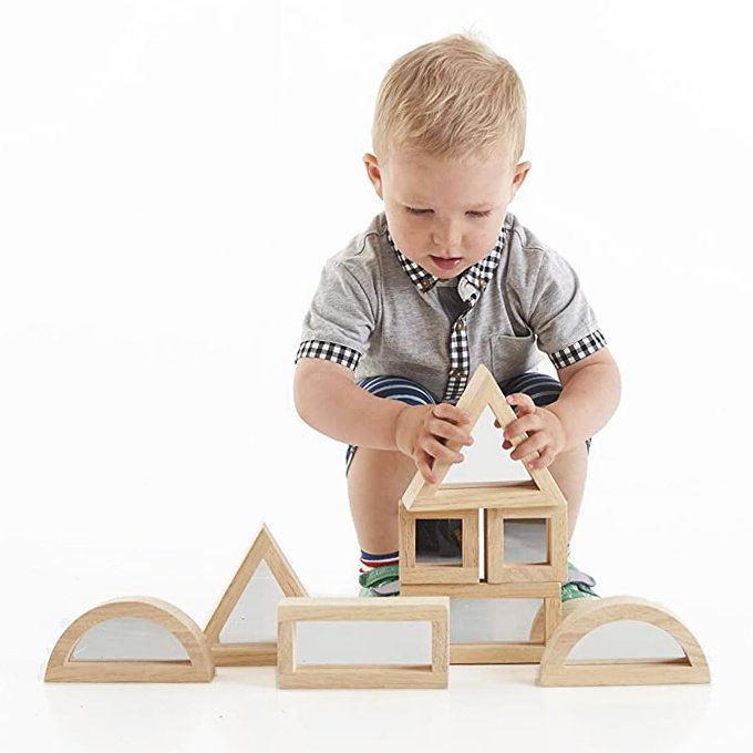 Deze bijzondere blokken van TickiT zijn aan beide zijden voorzien van spiegels (acryl dus niet breekbaar). Dit voegt een extra element toe aan het bouwen! Zie hoe de omgeving wordt weerspiegeld in de blokken. De blokken zijn lekker groot en stevig en ook leuk voor de allerkleinsten om zichzelf in te ontdekken. De blokkenset bestaat uit 2 vierkante blokken, 2 halfronde blokken, 2 rechthoekige blokken en 2 driehoekige blokken.