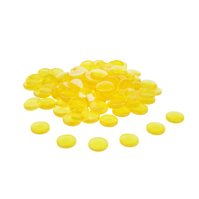 Met de transparante gele speelstenen – set van 100 stuks haal je veelzijdig materiaal in huis voor rekenen, sorteren en creatieve activiteiten. De stenen hebben een platte onderzijde en een bolle bovenzijde, waardoor ze een mooi lichtspel geven en ook als kleine vergrootglazen gebruikt kunnen worden.