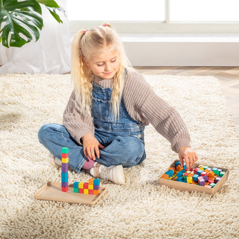Met deze set van 150 blokjes kunnen kinderen hun creativiteit de vrije loop laten. Zo kunnen kinderen bijvoorbeeld zelf bouwwerken creëren, de blokken op kleur sorteren, er mee rekenen of patronen creëren.