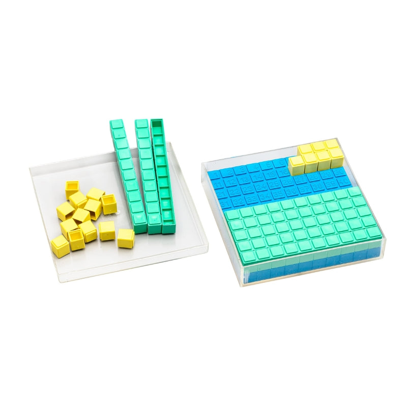 Het honderdveld is ontworpen met 100 genummerde vakken, elk gemarkeerd met een duidelijk cijfer van 1 tot 100. Hiermee kunnen kinderen gemakkelijk(er) de volgorde van getallen begrijpen en visualiseren. Daarnaast bevat het bord 20 gele eenheden blokjes en 8 groenen tientallen blokken die perfect passen in de genummerde vakken. Kinderen kunnen deze blokjes gebruiken om getallen te creëren en op een hands-on manier te begrijpen hoe getallen worden samengesteld.