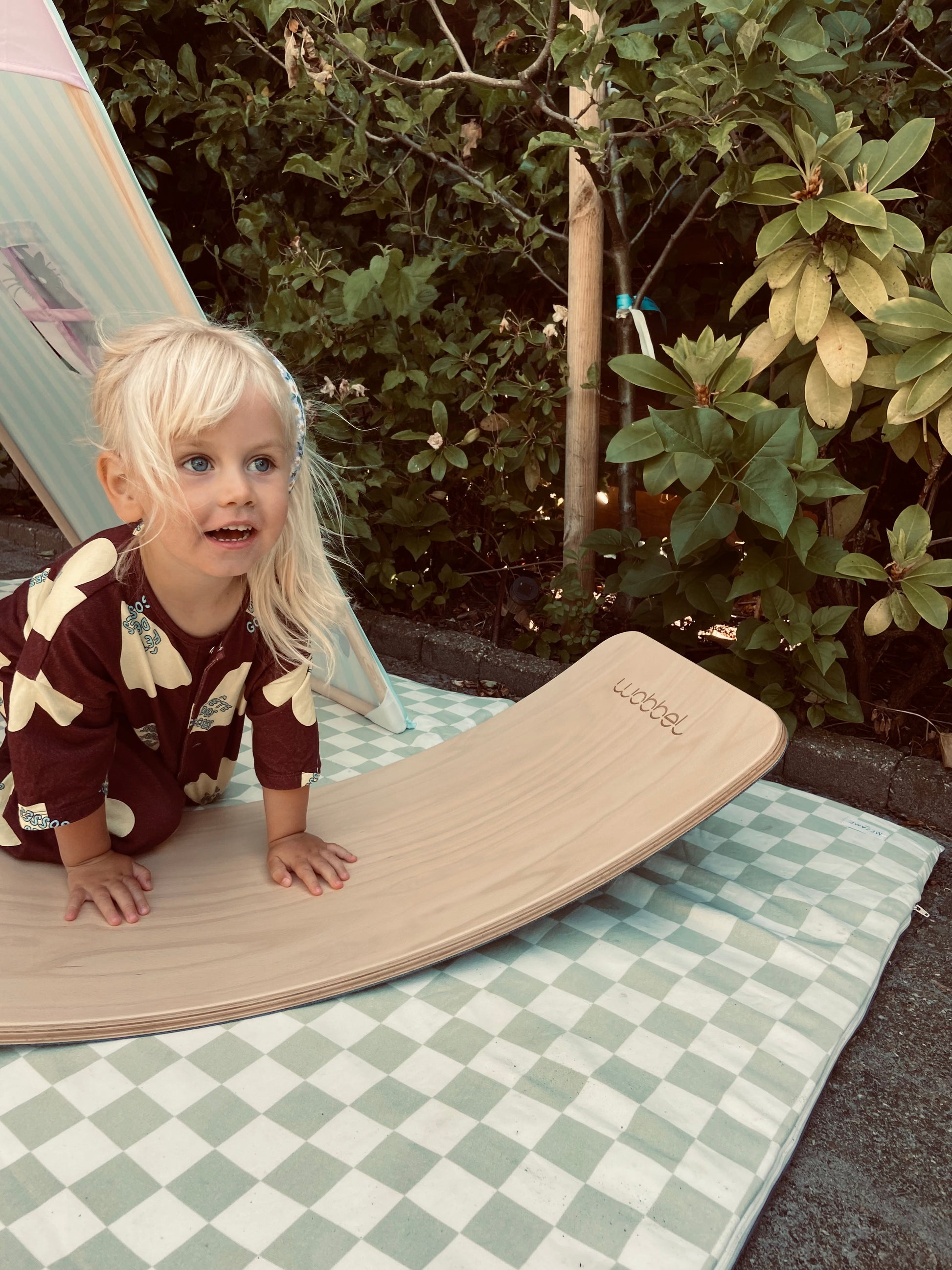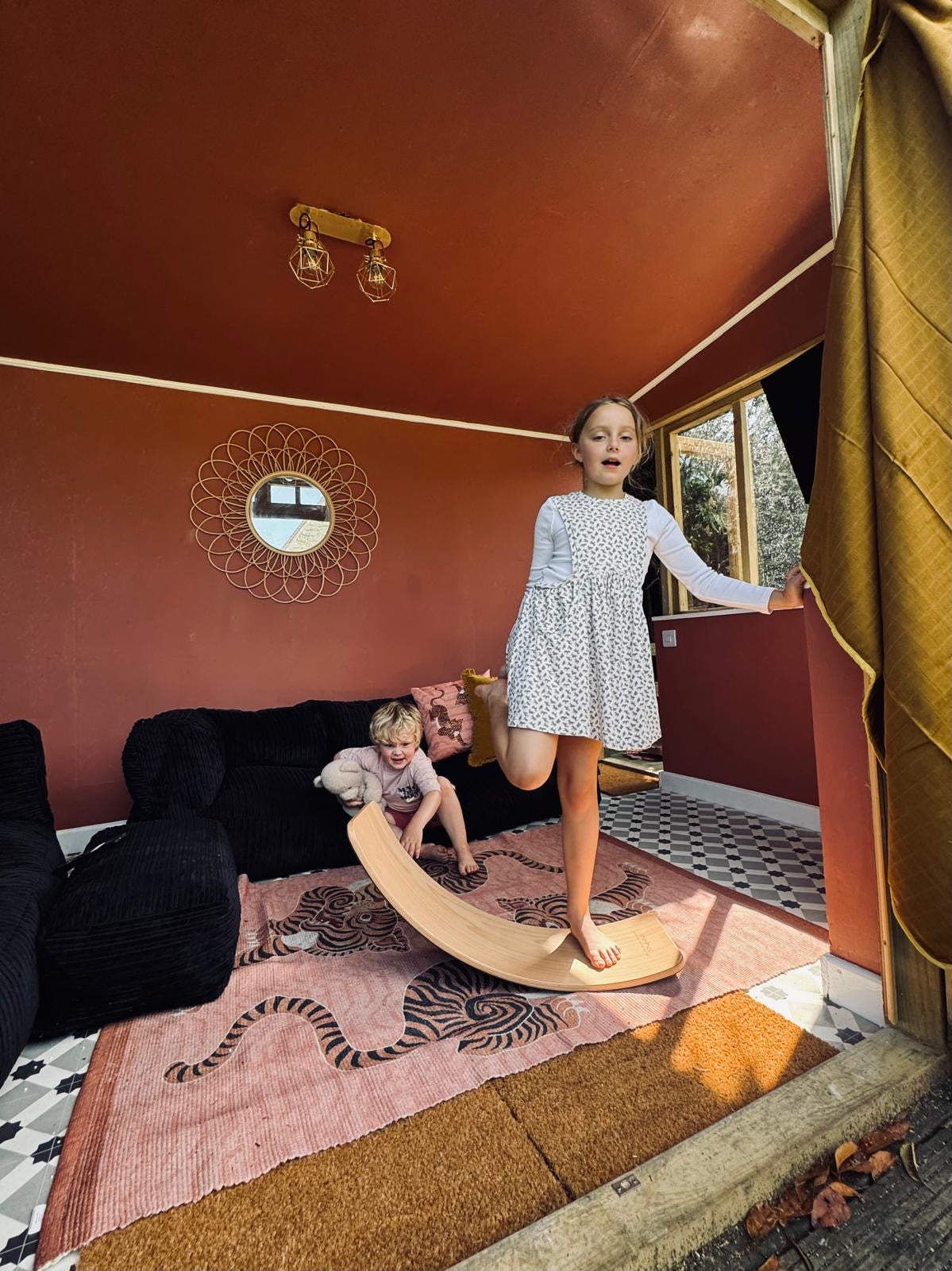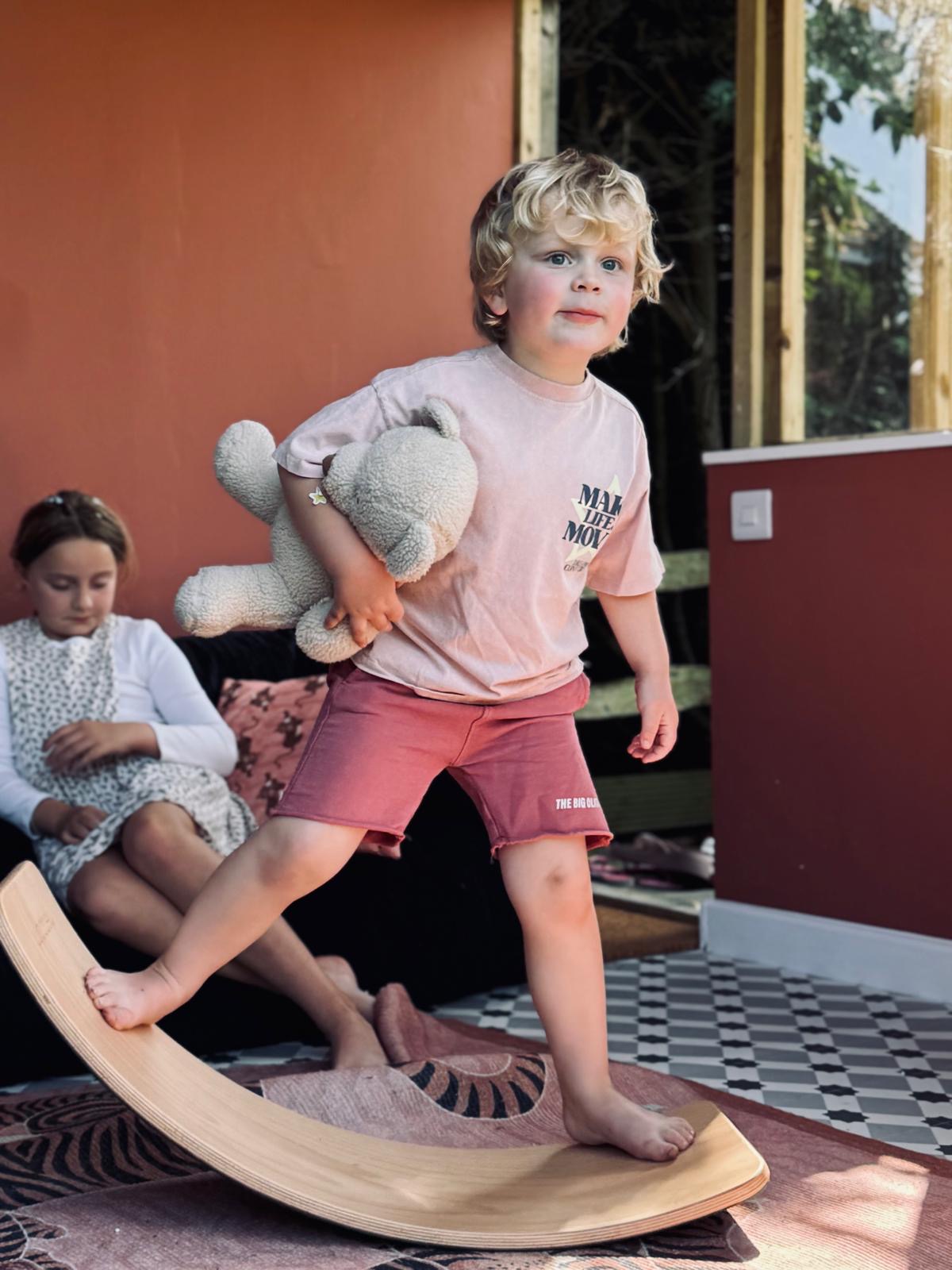 Met de Wobbel Large komt er een balansbord in huis dat qua formaat precies tussen de Original en de XL in zit. Dit model heeft een onderzijde met vilt, wat de vloer beschermt en het gebruik stiller maakt. De gebogen vorm maakt het geschikt voor balansactiviteiten, ontspannen liggen of creatief spel, en het stevige ontwerp is gemaakt voor langdurig gebruik.