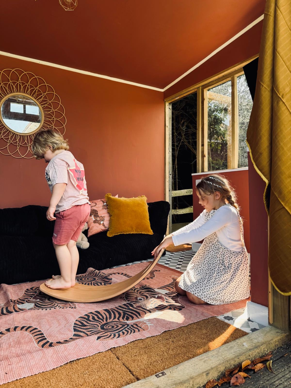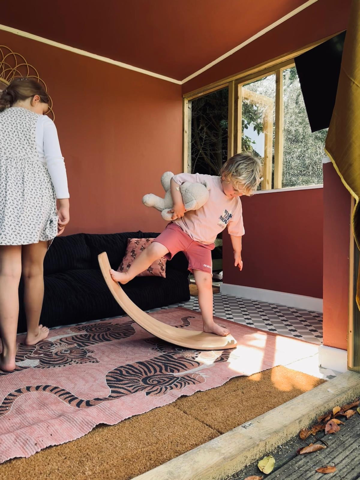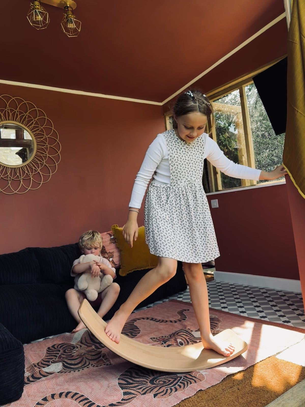 Met de Wobbel Large komt er een balansbord in huis dat qua formaat precies tussen de Original en de XL in zit. Dit model heeft een onderzijde met vilt, wat de vloer beschermt en het gebruik stiller maakt. De gebogen vorm maakt het geschikt voor balansactiviteiten, ontspannen liggen of creatief spel, en het stevige ontwerp is gemaakt voor langdurig gebruik.