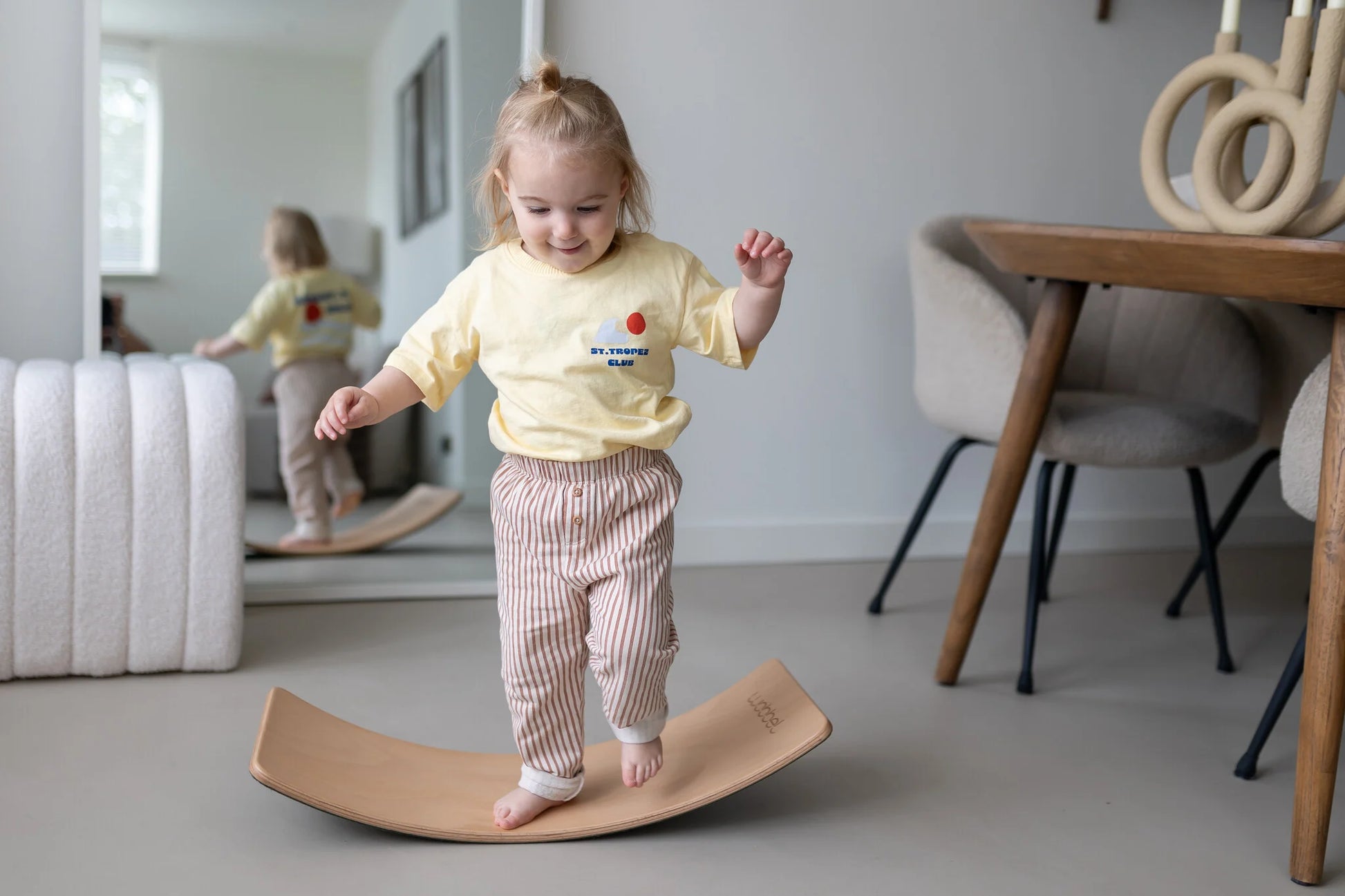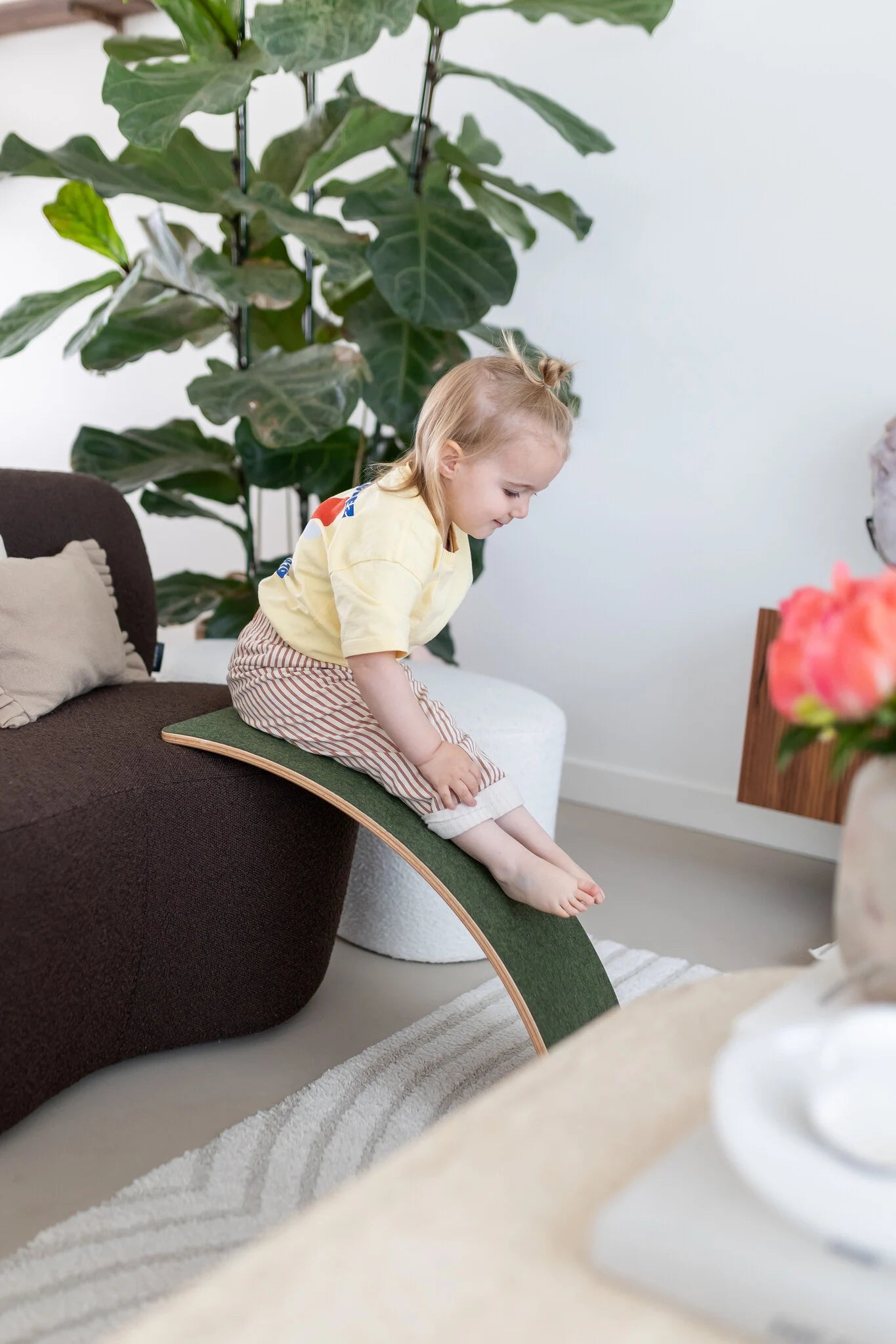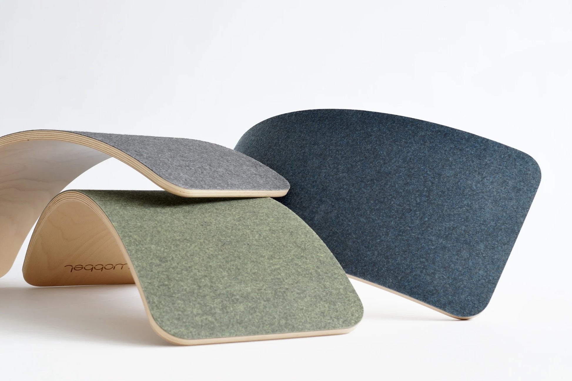 Met de Wobbel Starter met vilt komt er een balansbord in huis dat speciaal is ontworpen voor jonge kinderen. De minder sterke kromming en het dunnere, flexibelere ontwerp maken hem toegankelijk voor de kleinsten. De bredere hoeken zorgen voor extra stabiliteit wanneer het bord omgekeerd wordt gebruikt. Ondanks het compacte formaat kan dit model ook het gewicht van een volwassene dragen.