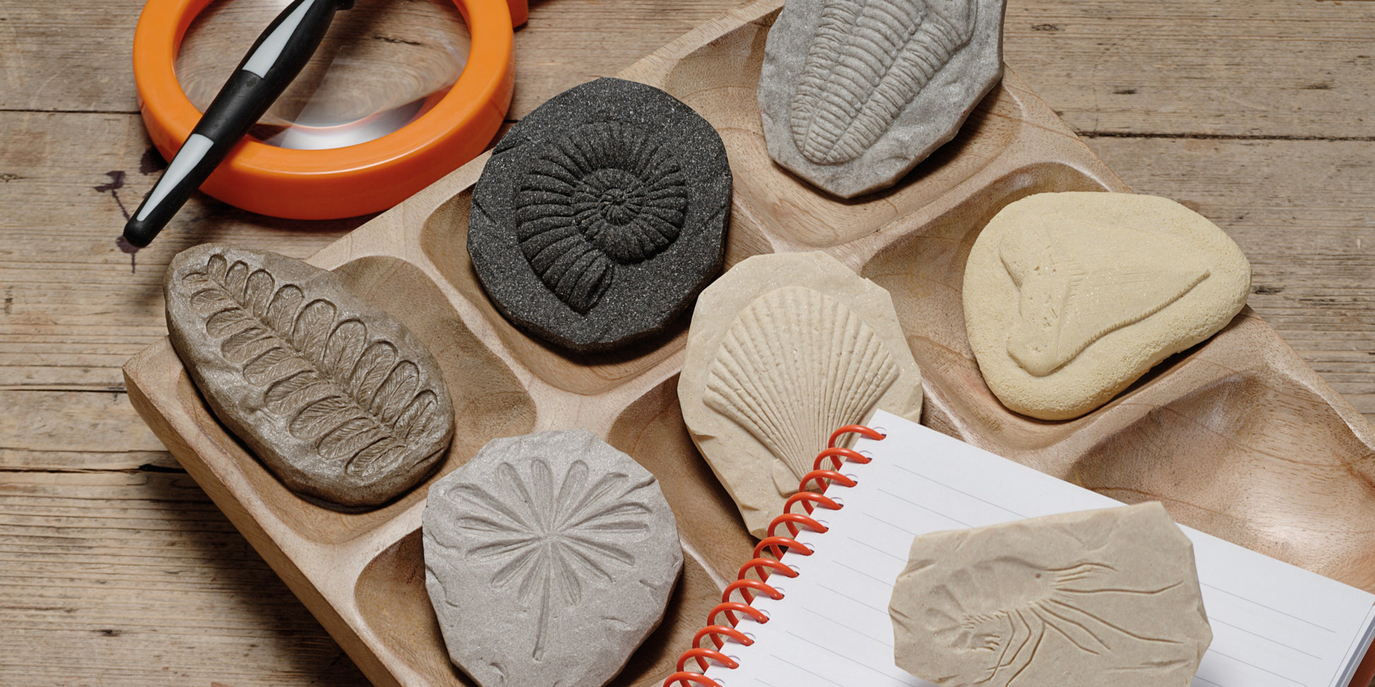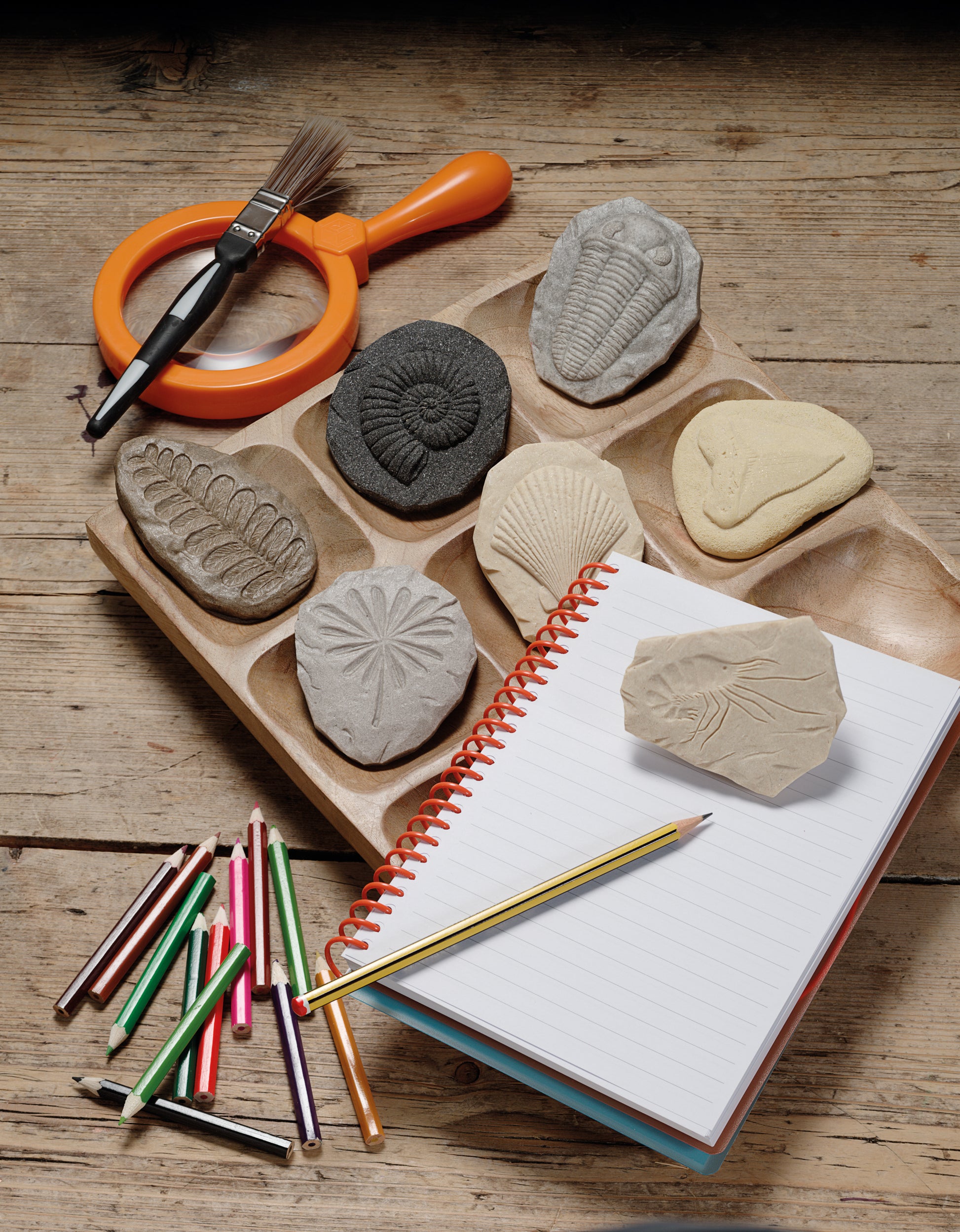 • Set van 8 fossielen – Bevat o.a. ammoniet, trilobiet, varens en andere afdrukken van dieren en planten.