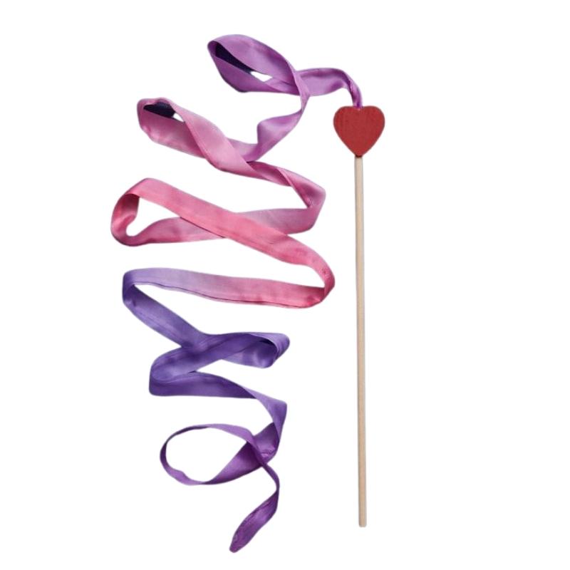 Het lijkt wel een toverstok met een glinterende zijden slinger! Schrijf in de lucht, dans en beweeg, laat glinsteren onder de zon... Dit speellint is fantastisch speelgoed voor eindeloos spel! Dit zwaailint heeft een staf met een rood hartje en een roze met paars lint. Laat al dansend, en bewegend met deze glinsterende zijden linten wonderen tot leven komen! Natuurlijk passen de kleuren perfect bij de kransen en andere speelzijde van Sarah's Silks!
